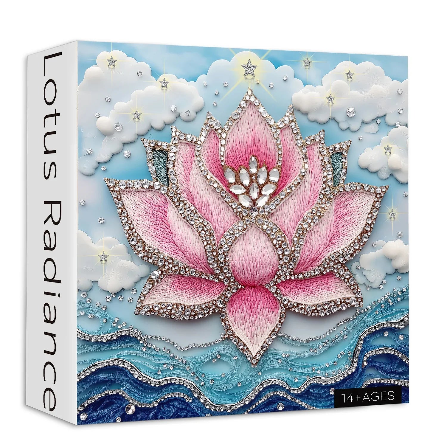 Eine atemberaubende rosa Lotusblume schwebt friedlich auf dem Meer, ihre Blütenblätter lebhaft und filigran, mit einem schimmernden silbernen Zentrum, das mit diamantähnlichen Edelsteinen geschmückt ist. Jedes Blütenblatt fängt die Eleganz der Natur in strahlenden Details ein.