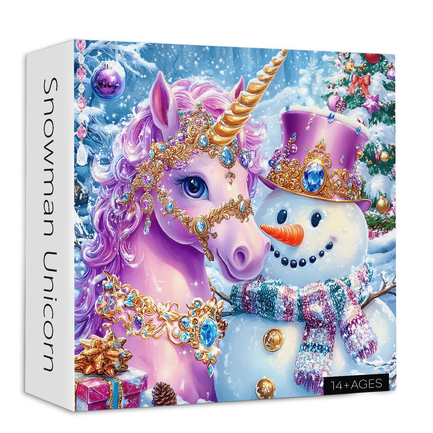 🦄⛄Magische Feiertagsszene:Mit einem schillernden, rosa Einhorn, das mit funkelnden Juwelen geschmückt ist und neben einem fröhlichen Schneemann in einem schneebedeckten Weihnachtswunderland steht. Perfekt für Einhorn- und Fantasy -Liebhaber.
