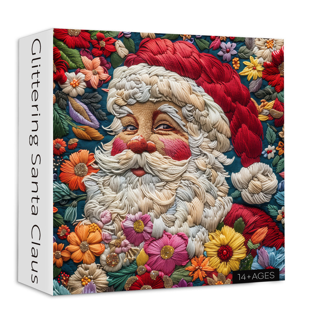Glitzernder Weihnachtsmann: 🎅✨ Tauchen Sie ein in den Charme unseres Glitzernden Weihnachtsmann-Puzzles, das einen lächelnden Weihnachtsmann zeigt, umgeben von lebhaften Blumen und Blättern im Stil einer Filzstickerei mit Glitzerfäden. Die organische Wolltextur und die reichen, hochauflösenden Farben erwecken diese festliche Szene zum Leben, mit komplizierten floralen Mustern, die das Gesicht des Weihnachtsmanns als Mittelpunkt wunderschön umrahmen.