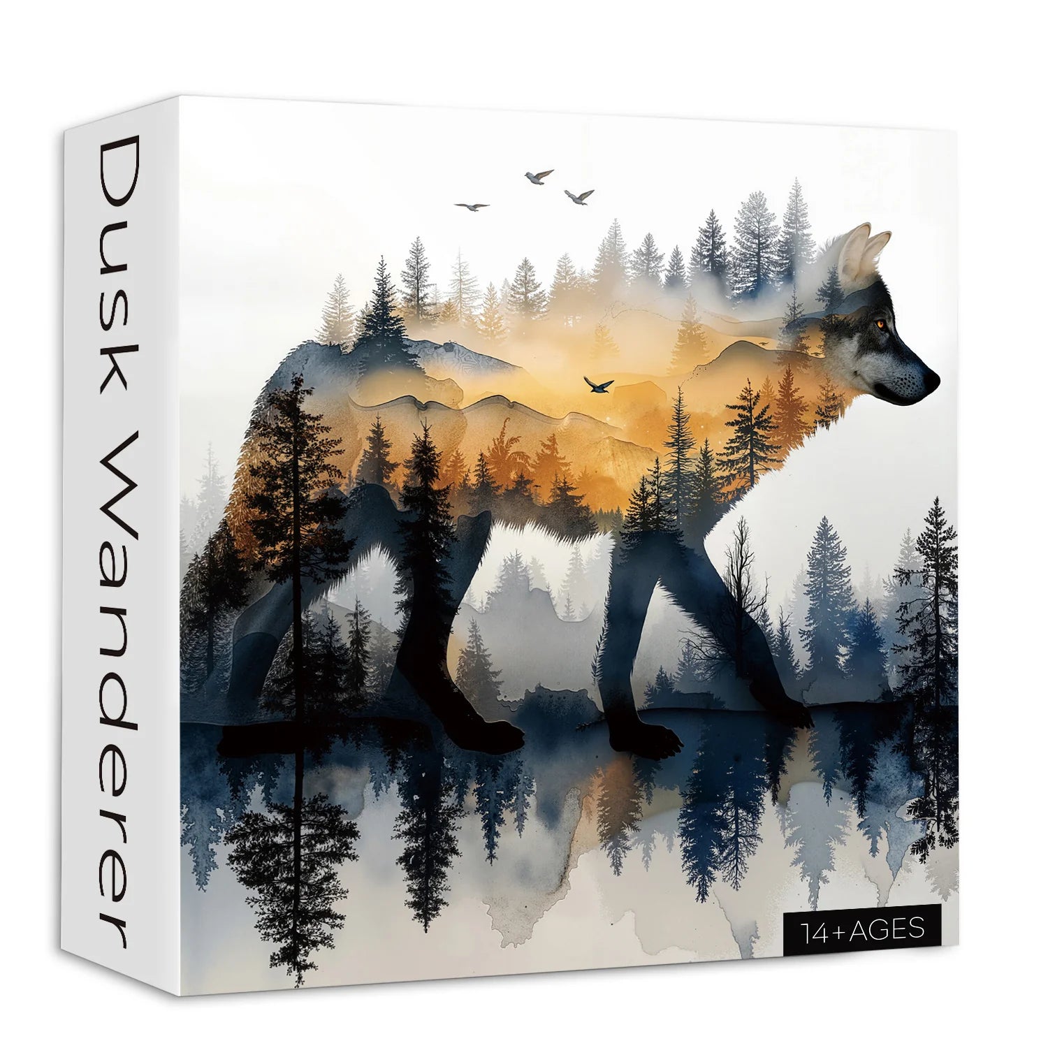 Step into the mystical world of twilight with Dusk Wanderer. This captivating puzzle features a lone wolf gracefully walking through a twilight forest, with soft hues of dusk painting the sky. The detailed forest, ethereal lighting, and majestic wolf create a tranquil and powerful atmosphere, inviting you into a world of serenity and adventure. 🌙🐺