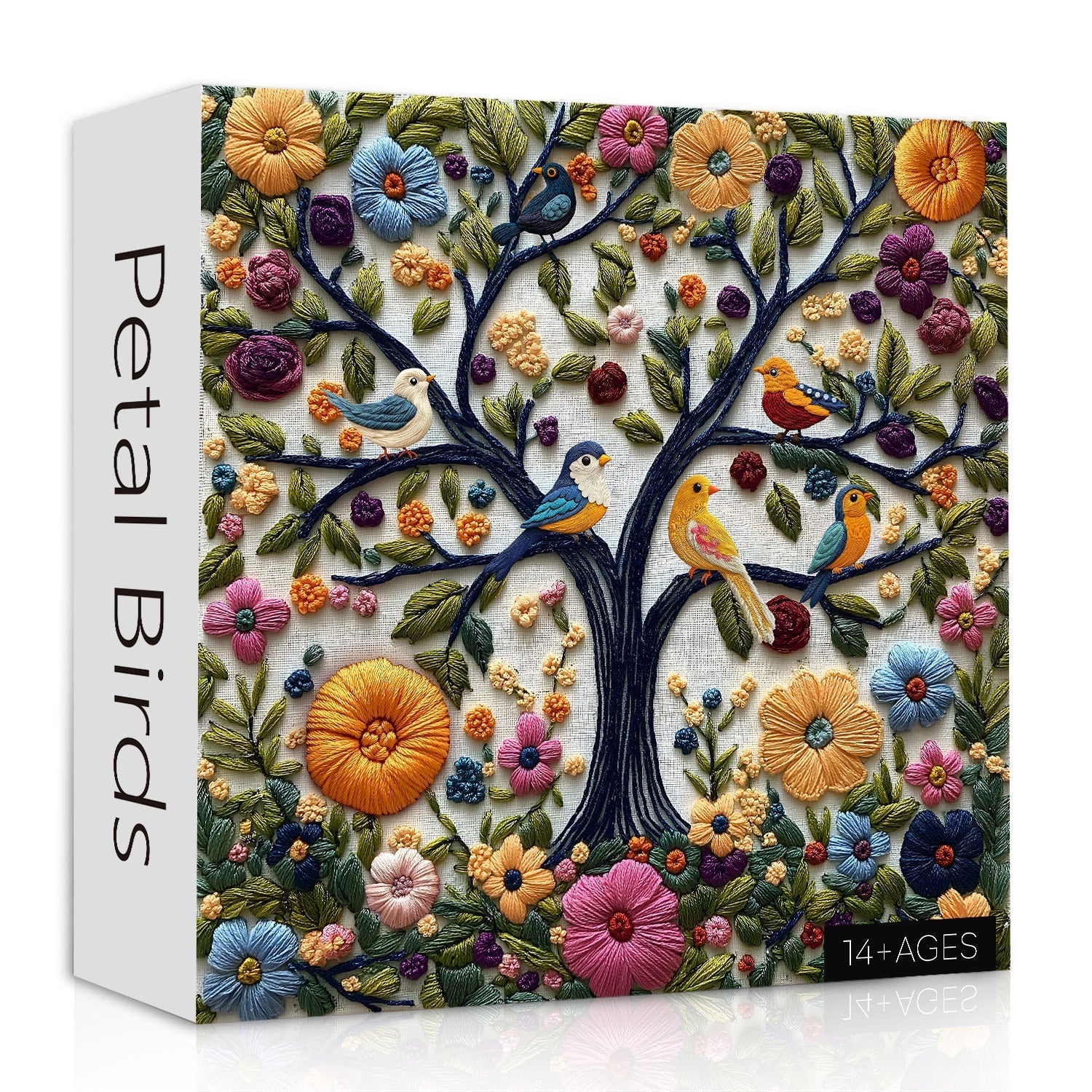 Impresionante Bordado-Inspirado Arte Este rompecabezas características a detallado 3D bordado diseño de pájaros, flores, y a árbol, capturado el encanto de hecho a mano puntadas con vibrante color y profundidad.